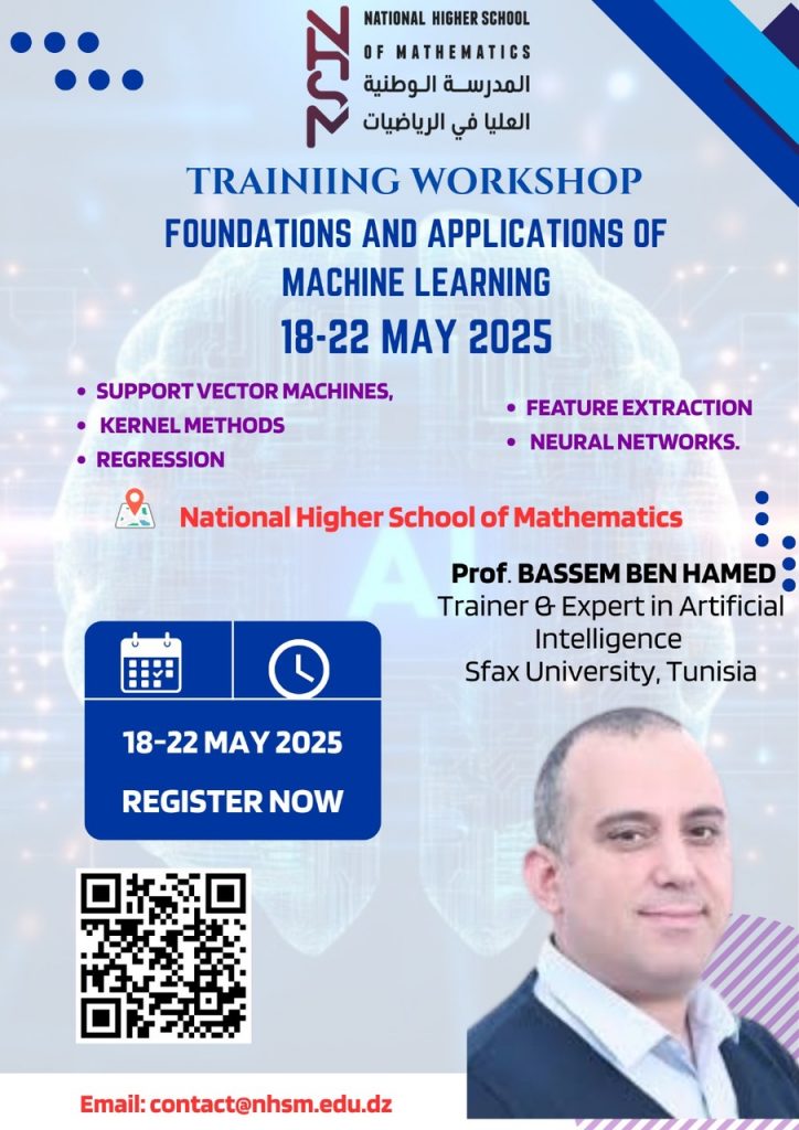 L’École Nationale Supérieure de Mathématiques (ENSM), Sidi Abdellah, organise un atelier de formation sur l’apprentissage automatique, animé par le Prof. BASSEM BEN HAMED, expert en Intelligence Artificielle de l’Université de Sfax, Tunisie.