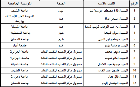 President of the National Pedagogic Committee of English: Prof.Leila Kara Mostefa-Boussena (ELT)Faculty of foreign languages, Department of English Director of Foreign Language Centre (CEIL) Chair of Diloui Research Team (TICELET Research Laboratory) Members: – Pr. BELABDELOUAHAB-FERNINI Linda M’Sila University -Pr. DJOUIBA Abdelkamel -Head of the ILTC M’Sila University – Pr. BOUHANIA Bachir -Exper – Pr. MESSEKHER Hayet : ENS Bouzareah – Pr. DOUIFI Mohamed -Head of the ILTC Algiers University 2 -Pr. EL OUCHDI Ilham -Head of the ILTC University of Tlemcen – Pr. MOUHADJER Nourredine -University of Tlemcen – Dr. ABILA-AMALOU Naima -Head of the ILTC Algiers -University 1 – Dr. BENALI REGUIEG-SAHRAOUI-Nacera -Head of the Department of English -University of Chlef -Dr Sahli Fatiha, Dean of the Faculty of Foreign Languages Constantine 1 University – Dr. FALI Wafa -Head of the ILTC University of Oran 2 – M. KHALDOUN Abdelkader -Head of the ILTC University of El Tarf -M. MOSTEFAOUI Mohamed Amine -Computer Science Engineer -University of Chlef | |