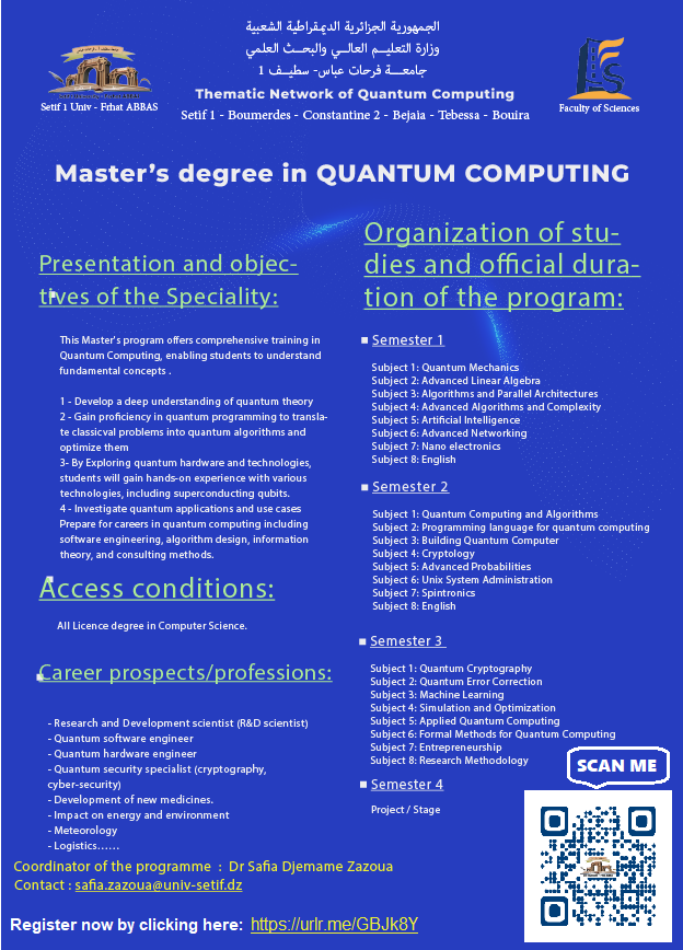 Le réseau thématique en ‘Informatique Quantique’ lance la formation Master en Informatique Quantique (Quantum Computing) au titre de l’année universitaire 2025-2026. Cette formation est habilitée à l’université Ferhat Abbas – Sétif 1 et ouverte aux détenteurs d’une Licence en Informatique.