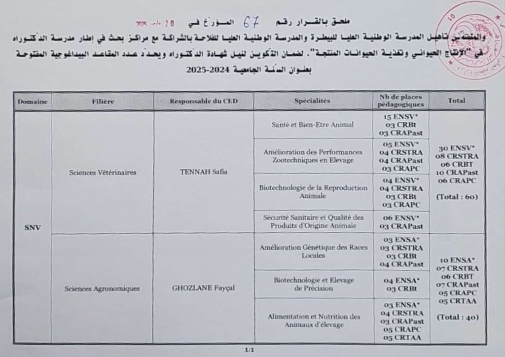Pour renforcer la vision de développement de l’état 2024-2029 dans le domaine de la recherche scientifique et du développement technologique liés à la production animale et à l’alimentation des animaux d’élevage, l’École Nationale Supérieure de Vétérinaire et l’École Nationale Supérieure d’Agronomie, en partenariat avec les centres de recherche concernés, ont été habilitées à ouvrir 100 postes pour assurer la formation en vue de l’obtention du doctorat via un concours national.
